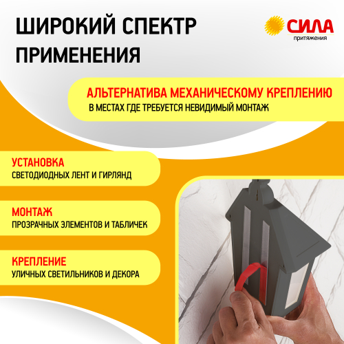 Применяется при установке и креплении почтовых ящиков, огнетушителей, светодиодных лент, номерных табличек, уличных светильников и другого декора. Высокопрочная альтернатива механическому креплению. Монтажная лента прочная, эластичная и подходит к разным материалам, устойчива к ударным и вибрационным нагрузкам, к атмосферным факторам (UV стойкая) и химреактивам. Можно использовать внутри и снаружи помещения на большинстве обработанных поверхностей, таких как дерево, металл, окрашенный бетон.