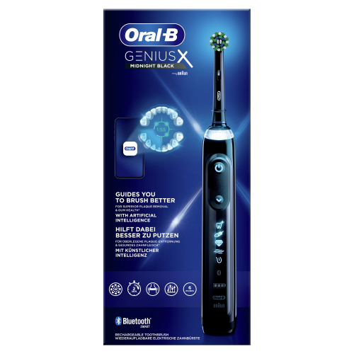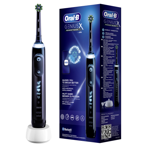 "Электрическая щётка Braun Genius X сделает ежедневную чистку зубов более качественной. Эта модель совместима со всеми насадки Oral-B. ЧТО УМЕЕТ Щетинки проникают глубоко в межзубное пространство и удаляют значительно больше загрязнений, чем обычная щётка. Благодаря возвратно-вращательному движению вы сможете более тщательно устранять налёт. Прибор работает в шести режимах: ежедневный, чувствительный, уход за дёснами, отбеливание, быстрый и для языка. ИНТЕЛЛЕКТУАЛЬНАЯ СИСТЕМА Щётка оснащена символьный дисплеем и электронным регулятором. Запрограммируйте таймер, и он подскажет вибрацией и светом, когда нужно завершить чистку или перейти на другую область. УДОБНО На корпусе есть индикаторы, показывающие режим, стадию зарядки аккумулятора и количество оставшейся в нём энергии. Отдельная лампочка загорается, если необходимо установить новую насадку. В щётке есть высокочувствительные сенсоры: при избыточном нажиме они прекратят её работу."