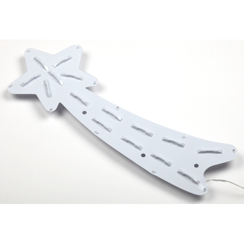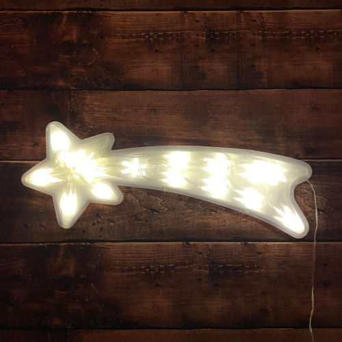 Новогодняя настенная светодиодная фигура ЭРА "Комета" (арт. Б0041937) для праздничного декора внутри и снаружи помещений. Защищена от влаги и пыли (IP44), отличается морозостойкостью. Работает от стандартной электросети 220 В, прозрачный провод практически не заметен. Изготовлена из ударопрочного пластика. LED-фигура представляет собой комету, похожа на падающую звезду. можно вешать как нравится: звездой влево или звездой вправо. Светится тёплым белым светом, который создаёт атмосферу уюта. Дизайн фигуры идеально подходит к зимним праздникам. Размеры фигуры: 55 х 4,2 х 25 см. В качестве источников света применены 15 ярких и экономичных светодиодов, которые не перегреваются даже при длительной работе без перерывов. Новогодняя LED-фигура - простой и быстрый способ создать праздничное настроение, украсить дом, офис, общественное пространство.