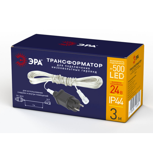 Трансформатор ЭРА (арт. Б0041911) для подключения низковольтных гирлянд подходит для использования как снаружи, так и внутри помещений. Он защищён от влаги и пыли по международному индексу IP44. С его помощью к стандартной электросети подключается даже большая новогодняя гирлянда с 500 светодиодными лампами. Преобразует входное напряжение 210-240 В в выходное 24 В. Изготовлен из меди и поливинилхлорида, не поддерживающего горение. Помимо своей основной функции, имеет и дополнительную - наращивает длину гирлянды на 3 метра. Это даёт возможность использовать праздничную иллюминацию на значительном расстоянии от сети.