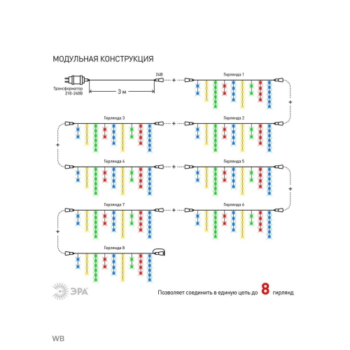 Разноцветная праздничная гирлянда ЭРА "Бахрома" (арт. Б0041906) со светодиодными лампочками на проводах разной длины. Создаёт многоуровневую нарядную подсветку, является идеальным решением для украшения окон, новогоднего оформления помещений. Защищена от влаги и пыли, морозостойка, поэтому с успехом может применяться на улице. Полупрозрачный повод практически не заметен - гирлянда будет хорошо смотреться в интерьере любого стиля. Длина гирлянды - 2 метра, максимальная длина отдельной нити - 1 метр. Каждая нить светится своим цветом - красный, зелёный, жёлтый или синий. LED-элементы формируют насыщенные яркие оттенки. Ровное приятное для глаз свечение создают 62 светодиода последнего поколения. Они не перегреваются даже при непрерывной многочасовой работе гирлянды и не тускнеют со временем. ЭРА "Бахрома" прослужит много лет, будет радовать в любой праздник. Современная светодиодная технология экономит до 90% электроэнергии. Гирлянда отвечает требованиям пожарной безопасности, работает от трансформатора. Трансформатор ЭРА, преобразующий входное напряжение 210-240 В в выходное 24 В: http://www.eraworld.ru/catalog/2647679 (Б0041911).