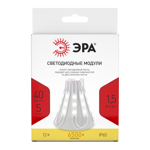 В упаковке находится 5 метровая лента из 40 модулей, на каждом модуле расположено по 3 светодиода с цветовой температурой 6500 К. Степень защиты модулей: IP65 применение внутри и снаружи помещений.