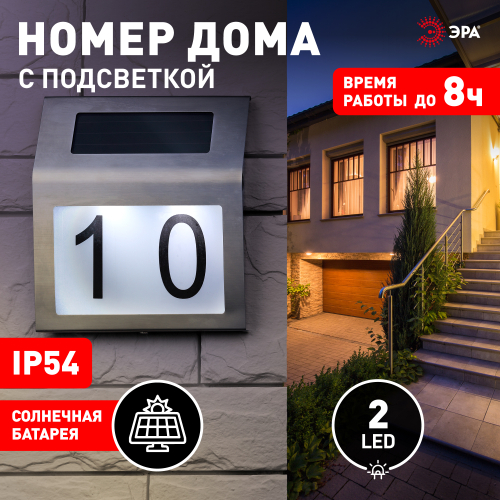 Благодаря подсвечиваемой номерной табличке с удобными креплениями на фасад здания, ваш участок приобретёт завершённый гостеприимный вид. В ассортименте ЭРА несколько указателей номера дома с подсветкой на солнечной батарее: ERAFS048-09 (арт. Б0044249), ERASF22-40 (арт. Б0053390). Светодиодный номер дома станет идеальным решением для определения вашего строения в ночное время. Светящийся номерной знак на дом защищен от воздействия осадков - IP44. Светодиодные номерные таблички от ЭРА не требуют вывода провода и подключения к электросети, поэтому монтируются быстро и в любом удобном месте на фасаде дома. В светлое время суток подзаряжаются, а с наступлением сумерек автоматически включаются, ярко подсвечивая номер вашего дома или дачи современными светодиодами. Стоит также отметить, что цифры и буквы к таким фасадным светильникам торговой марки ЭРА поставляются в комплекте. Вы получаете готовое решение, которое будет ещё до порога дома характеризовать вашу семью как гостеприимную и ценящуюю комфорт. Светильники и гирлянды ЭРА на солнечных батареях - экологически чистый и экономичный тип освещения. Их оценят и молодые люди, стремящиеся придерживаться экотрендов, и пенсионеры, внимательно относящиеся к материальным тратам.