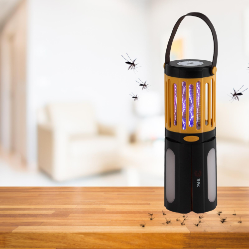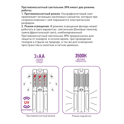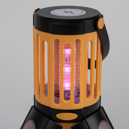 Противомоскитный светильник имеет два типа встроенных светодиодов: белые и ультрафиолетовые. Первые не оказывают никакого воздействия на насекомых и выполняют функцию уличной подсветки, вторые привлекают летающих насекомых, которые, подлетев к прибору соприкасаются со спиралью и получают удар током. Светильник имеет два варианта установки: его можно подвесить, либо раздвинув световые панели, установить на поверхности.