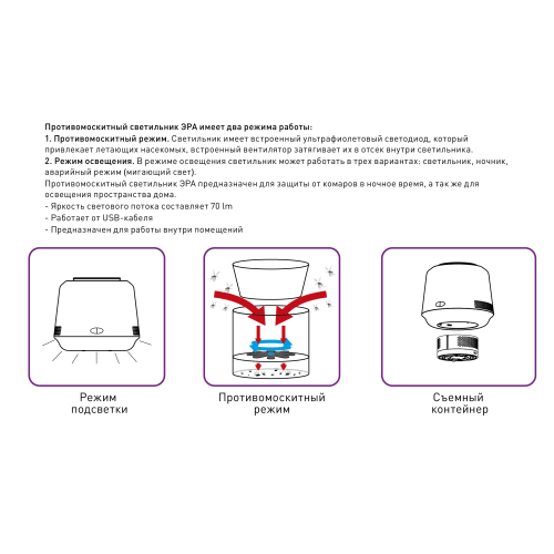 Антимоскитная лампа ЭРА ERAMF-07 незаменима во время летнего отдыха на даче. Она имеет стильный футуристический дизайн, компактна и особенно эффективна в деле защиты от насекомых. Лампа привлекает комаров ультрафиолетовым излучением. Насекомые затягиваются внутрь специальным вентилятором и остаются в отсеке, который легко очищать. Лампа-ловушка для насекомых также работает в режиме освещения. Можно выбрать один из трех вариантов: приглушенный ночник, яркий светильник, аварийный маяк. Яркость светового потока составляет 70 ml. Аксессуар легко взять с собой благодаря компактному размеру. Лампа от комаров подходит для использования внутри помещения, работает от USB-провода. Светильник обладает доказанной эффективностью в борьбе против насекомых, что позволит провести летнее время беззаботно.