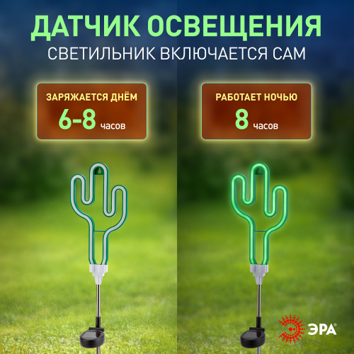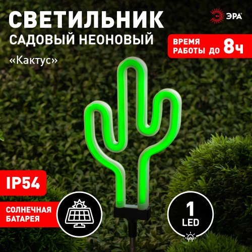 Беспроводной LED светильник ERASF012-31 "Кактус" станет забавным украшением Вашей дачной территории. Небольшие размеры позволят Вам разместить светильник около клумбы, украсить пространство рядом с прудиком или бассейном, изящно подсветить аллею или придомовую территорию. Фигурка из пластика высотой 41 см с легкостью вставляется в землю. Кроме того, есть возможность подвесить устройство на крючок. Садовый светильник функционирует на солнечной батарее. Такой вид получения энергии является самым экологичным, энергоемким, а также бесшумным. Питание происходит во включенном режиме, в светлое время суток. С наступлением темноты силуэт кактуса светится ярким зеленым светом. Необычный дизайн корпуса придает подсветке неповторимый стиль и создает праздничное настроение. Модель прекрасно подойдет в качестве декора к загородным вечеринкам. Обращаем Ваше внимание, что перед использованием фигурки её необходимо включить и зарядить. Светильник заряжается в течение всего светового дня. Работа от солнечной батареи рассчитана 8 часов непрерывной работы. Высокая степень защиты от пыли и влаги позволяет оставлять светильник на улице в неприятные погодные условия. Устройте экзотическую вечеринку вместе с неоновым светильником ERASF012-31 от компании ЭРА!