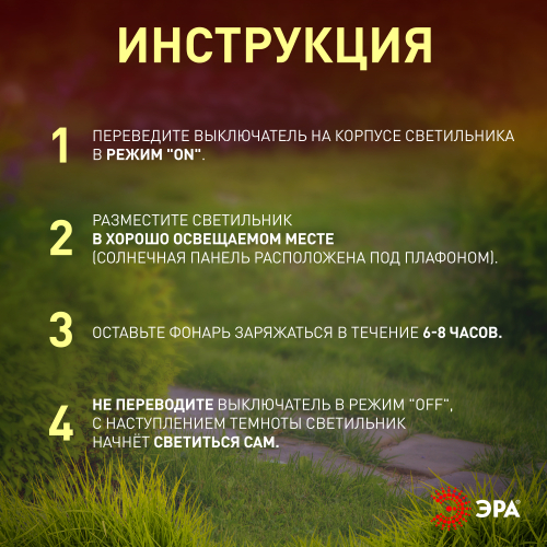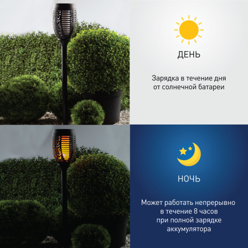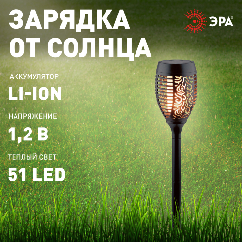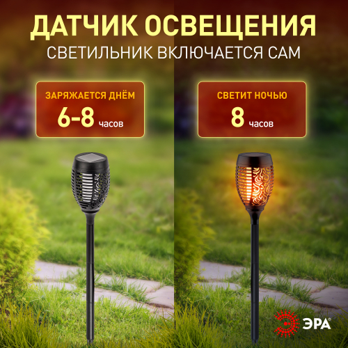 Садовый светильник ERASF012-35 "Факел" предназначен для подсветки сада, декоративного прудика, альпийской горки, цветов или придомовой территории. Модель имеет высоту в 72 см и без труда вставляется в землю. LED светильник работает на солнечной батарее. Такой вид получения энергии является наиболее экологичным, энергоемким, а также бесшумным. Питание происходит во включенном режиме, в дневное время. Самое интересное начинается после захода солнца. Через узорчатый корпус светильника начинает пробиваться огненный свет. Эффект пламени создает уютную обстановку и словно гипнотизирует. Необычный дизайн корпуса придает модели неповторимый винтажный стиль. Солнечная батарея предусматривает 8 часов непрерывной работы. Высокая степень защиты от пыли и влаги позволяет оставлять светильник на улице даже во время дождя. Корпус из ударопрочного пластика устойчив к падениям и тряске, не требует особого ухода. Обращаем Ваше внимание, что перед использованием фигурки её необходимо включить и зарядить. Светильник заряжается в течение всего светового дня. Подсветка для сада на солнечной батарее от бренда ЭРА эксклюзивное решение для преображения Вашей территории.
