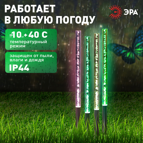 Садово-парковый светодиодный светильник ERASF024-22 "Пузырьки" станет необычным источником света для Вашего сада. В комплект входит 4 светильника, соединенных между собой. Оптимальная длина позволит Вам разместить конструкцию в палисаднике, украсить декоративный пруд или бассейн, необычно подсветить тропинку или придомовую территорию. Фигурки из ударопрочного пластика высотой 53 см с легкостью втыкаются в землю. Беспроводной LED светильник работает от солнечной батареи. Данный вид получения энергии является наиболее экологичным, энергоемким, а также бесшумным. Питание происходит во включенном режиме "ON", днем. Самое интересное начинается с наступлением темноты. Пузырьки начинают медленно переливаться желтым, зеленым, фиолетовым, розовым и оранжевым цветами. Такое световое шоу будет лучше всего смотреться в особо затемненных местах. Эффект пузырьков придает светильнику динамики, привлекает внимание. Работа от солнечной батареи рассчитана 8 часов непрерывной работы. Высокий показатель пыле и влагозащиты позволяет оставлять светильник на улице в непогоду. Обращаем Ваше внимание, что перед использованием фигурки её необходимо включить и зарядить. Светильник заряжается в течение всего светового дня. Уличный светодиодный светильник от бренда ЭРА лучший вариант для украшения Вашего сада.