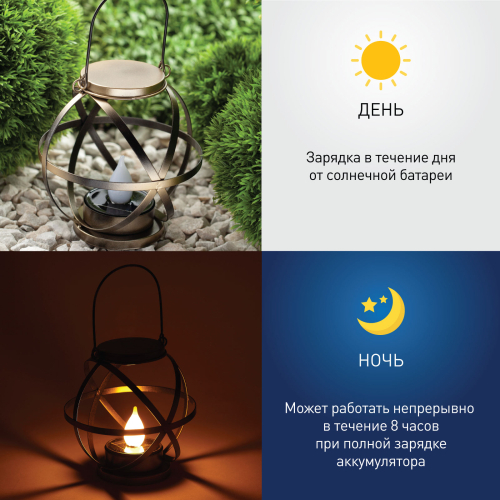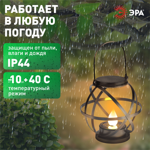 Подвесной садовый светильник ERASFM-01 "Лофт" придаст Вашей дачной территории таинственности. Небольшие внешние габариты позволят Вам подсветить тропинку, ворота или террасу. LED светильник функционирует на солнечной батарее. В качестве источника света искусственная светодиодная свеча. Такой способ получения энергии является самым экологичным, энергоемким, а также бесшумным. Самое интересное начинается после захода солнца: декоративная свеча начинает светиться теплым желты светом, создавая эффект пламени. Обстановка на участке приобретет таинственный характер за счет необычного решетчатого корпуса. Солнечная батарея предусматривает 8 часов непрерывной работы. Высокая степень защиты от пыли и влаги позволяет оставлять светильник на улице даже во время дождя. Обращаем Ваше внимание, что перед использованием фигурки ее необходимо включить и зарядить. Светильник заряжается в течение всего светового дня. Подвесной светильник для сада от компании ЭРА - чудесный вариант для стилизации Вашей территории.
