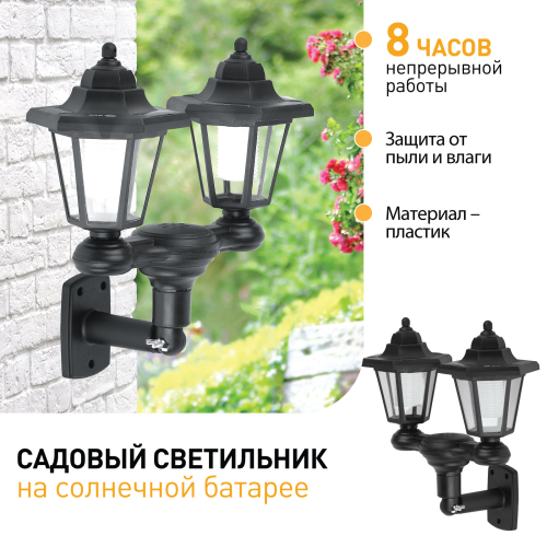 Фасадный светильник ERASV01-01 станет эффектным источником света придомовой территории, террасы, беседки, гаража. Садово-парковый светильник имеет несколько режимов установки: Вы можете зафиксировать устройство на стене с помощью крепления в комплекте или воткнуть в землю, используя заостренную ножку. Высота светильника 150 см. LED светильник функционирует на солнечной батарее. Такой способ получения энергии является максимально экологичным, энергоемким, а также бесшумным. Питание происходит во включенном режиме, в дневное время. Изящный фонарь будет заметен издалека, в ночное время будет освещать территорию приятным белым светом, создавая особый антураж. Питание от солнечной батареи рассчитано на 8 часов непрерывной работы. Высокая степень защиты от пыли и влаги позволяет оставлять светильник на улице даже во время дождя. Корпус из ударопрочного пластика устойчив к механическим повреждениям. Обращаем Ваше внимание, что перед использованием фигурки её необходимо включить и зарядить. Светильник заряжается в течение всего светового дня. Декоративный светильник фонарь от бренда ЭРА лучший вариант для украшения Вашего сада.