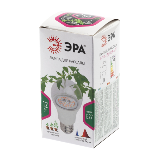 Лампа ЭРА FITO-12W-RB-E27 красно - синего спектра для выращивания рассады, досветки комнатных цветов станет Вашим не заменимым помошником. Данная лампа отлично подходит для зелени, пасленовых. Рекомендуемая высота расположения лампы над листьями от 5 до 25 см. Соотношение синего к красному как 1 к 3 дает возможность растениям марш бросок на набор питательных веществ и рост листьев. Так как масса выращиваемых растений прямо пропорциональна затраченной мощности, необходимо понимать что усиление эффекта от лампы возможно при увеличении светового потока. Для избежания ожега листьев мощность не должна превышать 450 Вт на м2. при высоте подвеса 4 местра. Прозрачный поликарбонатный рассеиватель сохраняет выходящюю энергию, в отличие от ламп с молочным рассеивателем. Новый рейстайлинг лампы ЭРА FITO-10W-RB-E27-K лампа ЭРА FITO-10W-RB-E27 отличился более хорошей светоотдачей, связанной более хорошей подобранной биновкой светодиодов, более низким током через кристалл, что позполило снизить температуру на светодиоде на 5 градусов и соответственно увеличить их срок жизни. Разгруженным драйвером, что позволило уменьшить температуру на управляющей микросхеме на 10 градусов, что так же увеличит ресурс ее работы. Спектрограмма и суммарная мощность лампы не изменилась.