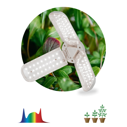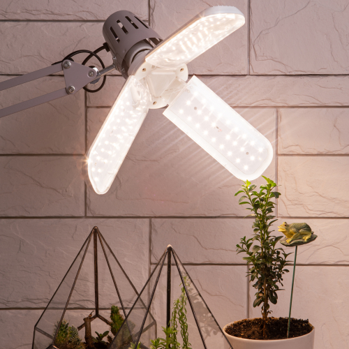 Эта удобная бытовая фитолампа-трансформер полного спектра по своей мощности и эффективности не уступает профессиональному фитопрожектору. Обеспечивает качественную досветку 2 кв м рассады. Мягкий белый свет комфортен для глаз человека. Поворотные лепестки позволяют быстро и без усилий изменить направление и интенсивность освещения конкретных растений. Эффектный внешний вид и максимальный комфорт в применении. На каждом лепестке по 27 светодиодов. Каждый лепесток поворачивается на 180 градусов. Индивидуальное регулирование наклона и направления светодиодных лепестков даёт возможность создать множество уникальных сценариев подсветки растений.