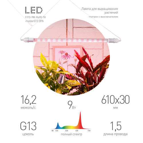Линейный фитосветильник FITO-9W-Ra90-Т8+holderG13 полного спектра IP 65 c выключателем и вилкой от ЭРА – оптимальное решение для освещения растений, будь то комнатные цветы, садовая рассада или тепличные культуры. Этот светильник полного спектра, сертифицированный по ГОСТ 57671-2017, обеспечивает растения необходимым светом для здорового роста и развития. Благодаря 56 светодиодам, создающим направленное белое освещение, и прозрачному стеклу, усиливающему воздействие на растения, этот светильник гарантирует эффективное использование света. Его компактные размеры (60 см в длину и 2,7 см в диаметре) позволяют разместить его даже в ограниченном пространстве, а полутораметровый шнур питания обеспечивает удобство подключения. Линейный фитосветильник FITO-9W-Ra90-Т8+holderG13 идеально подходит для использования в жилых помещениях, гроубоксах и оранжереях. Площадь освещения составляет 0,7 м2, а для гидропонного выращивания рекомендуется использовать 25 ламп на 1 м2. Этот фитосветильник безопасен для человека, обладает низким коэффициентом пульсаций (5%) и создает комфортное теплое свечение с цветовой температурой 4000 К. С ним ваши растения будут получать достаточно света круглый год, что обеспечит обильное цветение и богатый урожай.