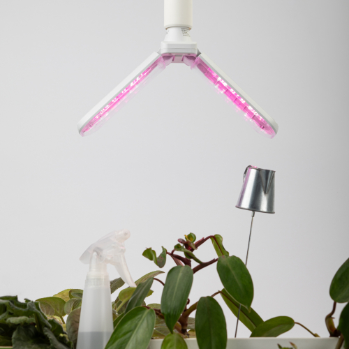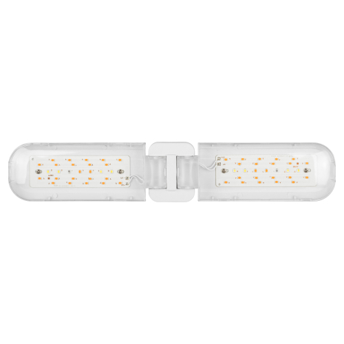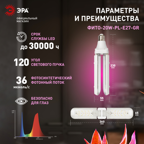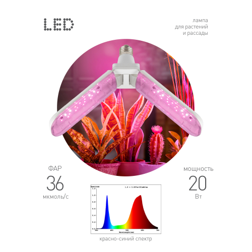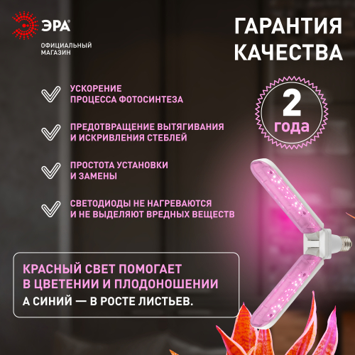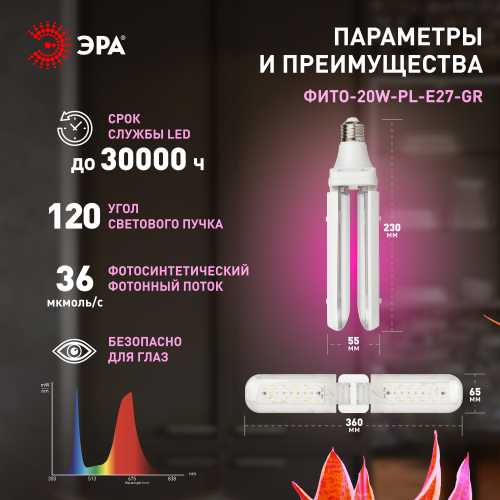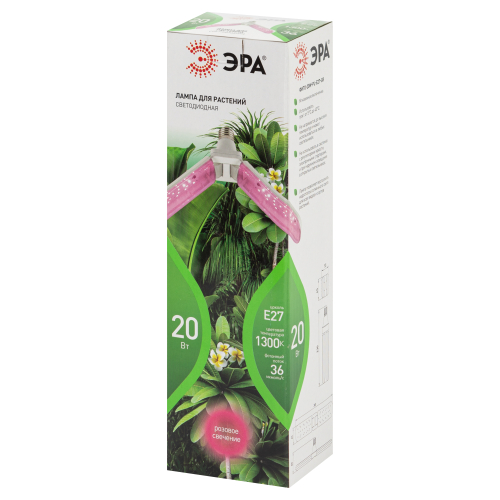 2-лепестковая фитолампа ЭРА Green Line красно-синего спектра. Мощность — 20 Вт, площадь досвечивания составляет 0,5 м2. Лепестковые фитолампы с удлинёнными плафонами, меняющими угол наклона, завоевали большую популярность у растениеводов. Они эстетично выглядят и удобны в применении. Правильно выбранный угол наклона позволяет эффективно досвечивать растения, грамотно направляя световые потоки.