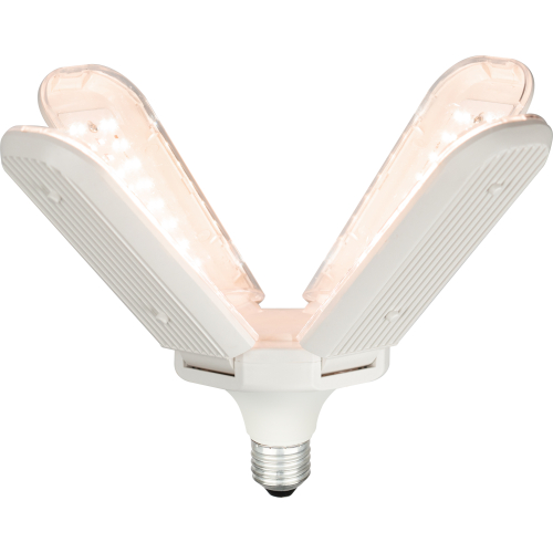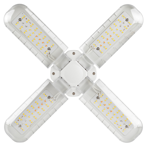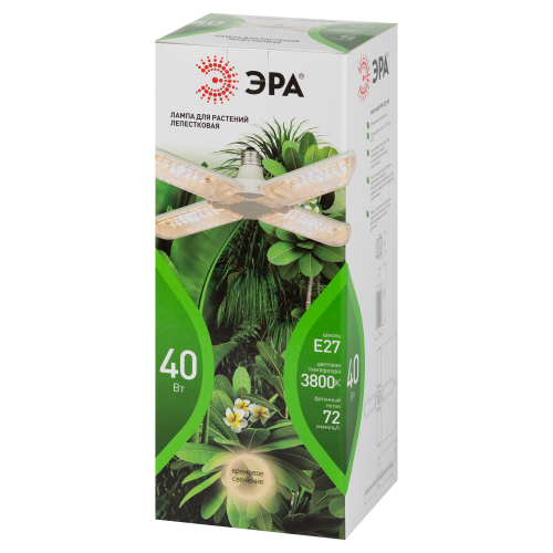 Мощная лепестковая фитолампа 40 Вт с цоколем Е27, полный спектр. Обеспечивает досветку на площади 2 кв. м с фотонным потоком 72 мкмоль/с. Особенность конструкции — четыре поворотных лепестка (каждый на 180°) с 40 светодиодами, что позволяет индивидуально настраивать направление света. Наличие инфракрасных диодов предотвращает вытягивание рассады. Габариты лампы — 245×105×105 мм, рабочая высота от 15 до 75 см.