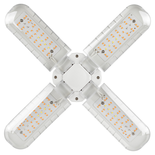 Конструкция лампы с перфорацией и алюминиевыми платами обеспечивает эффективный отвод тепла, предотвращая перегрев светодиодов. Каждый лепесток содержит 40 светодиодов, а общий фотонный поток составляет 72 мкмоль/с. Мягкий фиолетовый свет комфортен для глаз человека, а наличие инфракрасных светодиодов предотвращает вытягивание рассады.