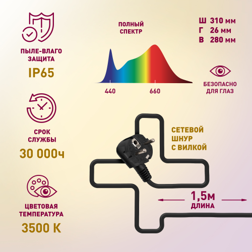 Пауэрфактор 0,97 — данный прожектор для растений экономит активную мощность, не перегружая электрические сети. Светит мягким бледно-розовым светом, не раздражающим глаза человека и домашних питомцев. Полный спектр особенно эффективен для выращивания растений в периоды цветения и плодоношения.