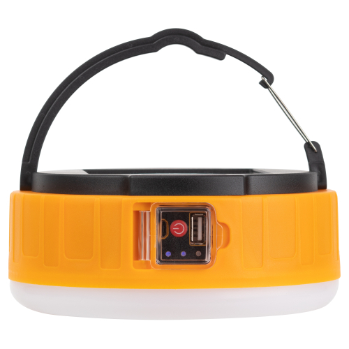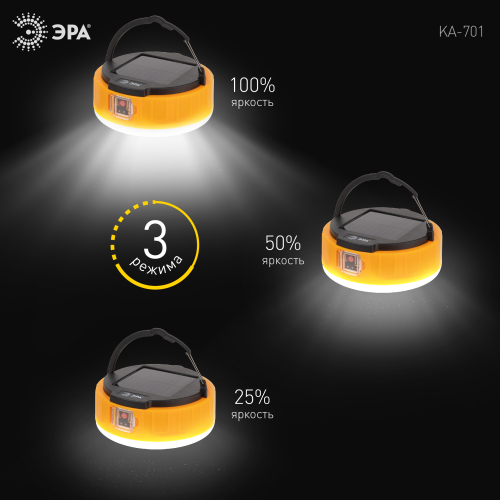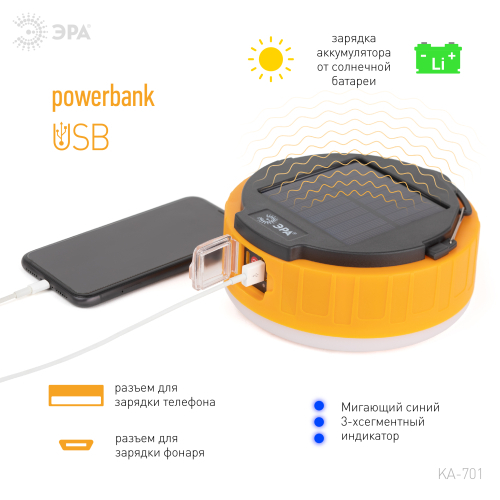 ЭРА КА-701 «Персей» – современный фонарь для кемпинга со встроенной солнечной батареей и пультом дистанционного управления. Аккумуляторный фонарь ЭРА «Персей» также заряжается от USB (кабель в комплекте). От одной зарядки непрерывно проработает 12 часов. Может использоваться в качестве powerbank – в условиях похода выручит, если нужно подзарядить телефон или другой мобильный гаджет. Мигающий 3-сегментный индикатор покажет уровень заряда аккумулятора. Разъёмы для зарядки фонаря и телефона, а также кнопка включения и управления режимами освещения, спрятаны в специальном отсеке под прозрачной пластиковой крышкой.