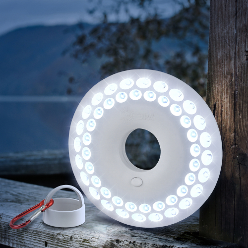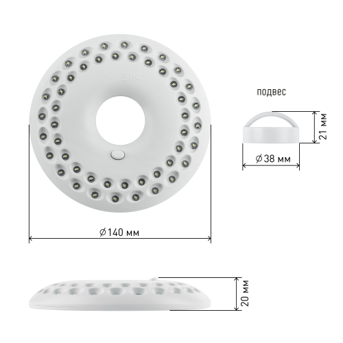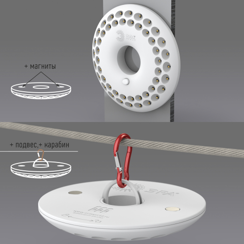 Светодиодный кемпинговый фонарь в футуристичном дизайне, специально разработанном компанией ЭРА. Фонарь предназначен для активного отдыха, отдыха на природе, для пикников, дачи. Дизайн фонаря функционален. 48 мощных светодиодов расположены по кругу таким образом, чтобы освещать максимально большую площадь ярким белым. Светодиоды энергоэкономичны, не перегорают и не требуют замены. Посередине фонаря предусмотрено отверстие, если надеть фонарь на любую подставку, например, на бутылку, получится настольный светильник. Фонарь оснащён мощным магнитом, так что его легко приклеить к металлической поверхности.