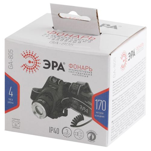 ЭРА GA-805 налобный аккумуляторный фонарь с яркими экономичными светодиодами CREE мощностью 5 Вт. Фокус фонаря можно изменять, выбирая между дальним направленным лучом и ближним широким светом. В комплекте мягкий эластичный ремешок с брендированием и возможностью регулировки размера. Корпус фонаря изготовлен из ударопрочного пластика, устойчивого к механическим повреждениям, царапинам, сколам. Устройство прослужит долго и сохранит свой презентабельный вид. Фонарь выполнен в базовом черном цвете с матовым покрытием, линза обрамлена эффектным кольцом стального оттенка. ЭРА GA-805 компактен и удобен в использовании не требует батареек, подзаряжается от USB.