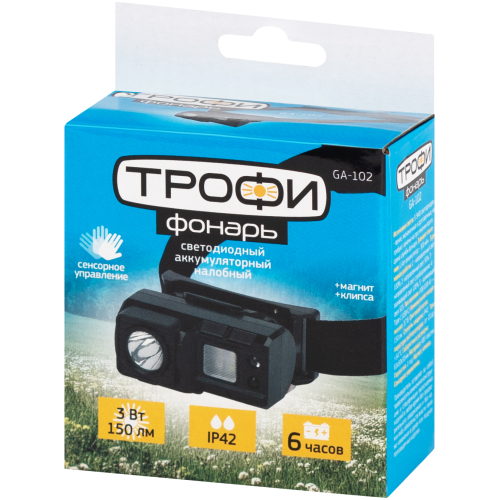 Фонарь налобный светодиодный Трофи GA-102 аккумуляторный 3 Bт сенсорное управление магнит клипса 5 режимов