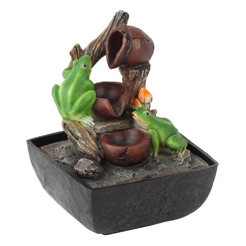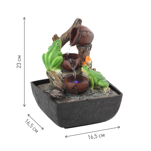 Если в собственном доме или квартире вы желаете обустроить уютный уголок, где так приятно отдохнуть после тяжелых трудовых часов, обратите внимание на настольный фонтан. Созерцание потока воды с нежным журчанием производит ощутимый релаксационный эффект, успокаивая и расслабляя. Этот небольшой фонтан высотой 24 см украшен жизнерадостными лягушками, отлично детализирован, его хочется рассматривать. Такой симпатичный декор будет радовать взгляд и поднимать настроение. Оснащен светодиодной подсветкой. Фонтан функционирует от сети.