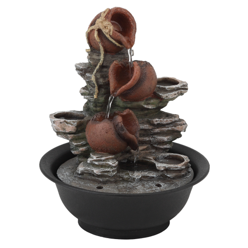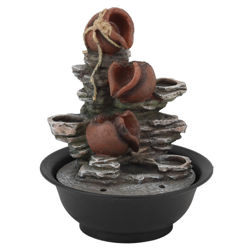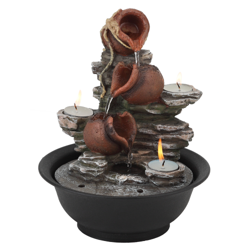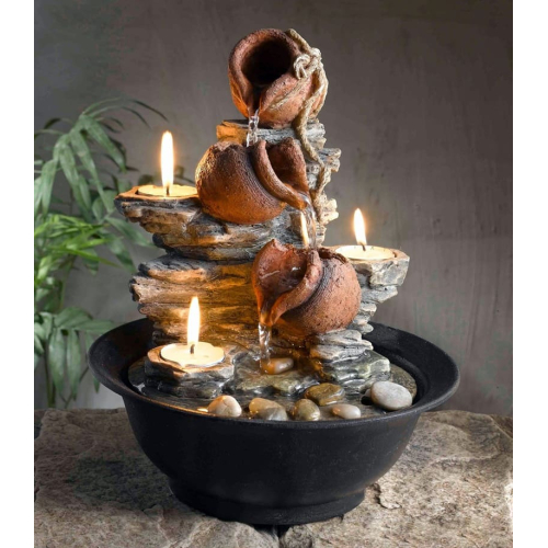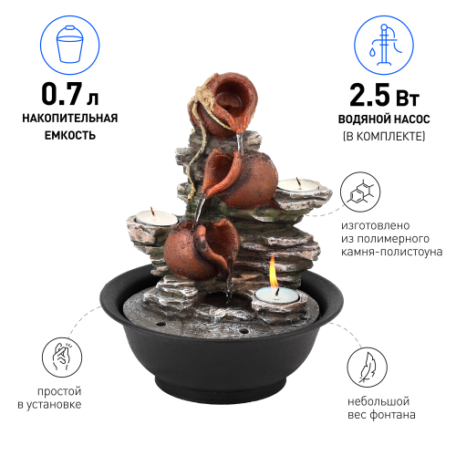 Если в собственном доме или квартире вы желаете обустроить уютный уголок, где так приятно отдохнуть после тяжелых трудовых часов, обратите внимание на настольный фонтан. Созерцание потока воды с нежным журчанием производит ощутимый релаксационный эффект, успокаивая и расслабляя. Компактный настольный фонтан Свечи высотой 30 см хорошо детализирован, поэтому его интересно рассматривать. Такой декор для кухни, гостиной или офиса будет радовать взгляд и поднимать настроение. Устройство функционирует от сети.