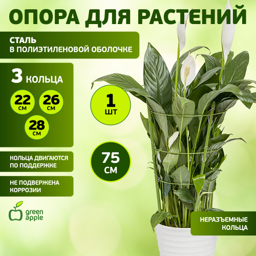 Поддержка для цветов состоит из 3-х колец и используется в качестве опоры для садовых и комнатных растений. Благодаря пластиковому покрытию она не подвержена воздействию окружающей среды. За счет зеленого цвета поддержка не отвлекает на себя внимание, легко маскируется среди ветвей. Кольцевая опора для растений высотой 75 см используется в качестве поддержки раскидистых культур. Отличается прочностью, устойчивостью к агрессивному воздействию окружающей среды. Не гниет, не имеет ограничений по сроку годности. Хорошо выдерживает вес растений, не деформирует листовые пластины и стебли. Диаметры колец: 28 см, 26 см, 22 см.