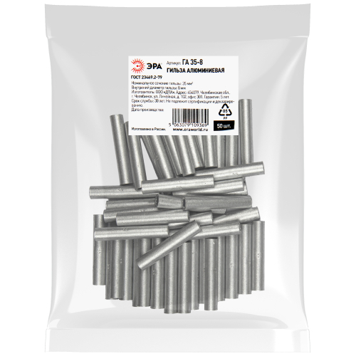 Гильза алюминиевая ЭРА ГА 35-8 используется для соединения алюминиевых жил проводов и кабелей с сечением до 35 мм² и применяется для кабелей напряжением до 35 кВ.
