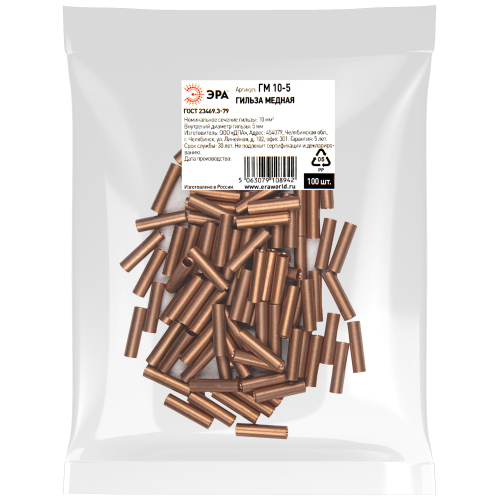 Гильза медная ЭРА ГМ 10-5 используется для соединения медных жил проводов и кабелей с сечением до 10 мм² и применяется для кабелей напряжением до 10 кВ.