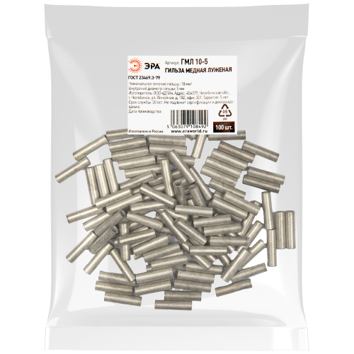 Гильза медная луженая ЭРА ГМЛ 10-5 используется для соединения медных жил проводов и кабелей с сечением до 10 мм² и применяется для кабелей напряжением до 10 кВ.