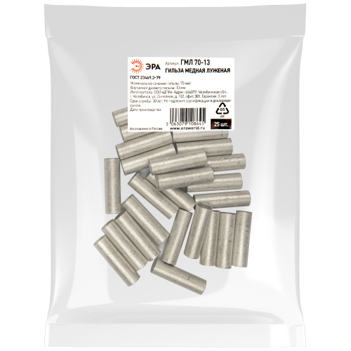 Гильза медная луженая ЭРА ГМЛ 70-13 используется для соединения медных жил проводов и кабелей с сечением до 95 мм² и применяется для кабелей напряжением до 10 кВ.