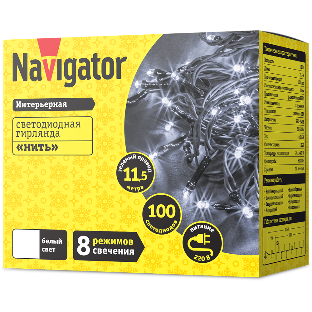 Гирлянда светодиодная 14 022 NGF-S01-100CW-10-11.5m-230-C8-G-IP20 Navigator 14022 с 8-мью режимами свечения станет неотъемлимым дополнением интерьера под любой праздник. Обладая светодиодами с белым светом, а также длиной 11,5 м с количеством светодиодов 100 шт. гирлянда подойдет для помещений, в которых необходимо ненавязчиво подчеркнуть торжественность с помощью световых акцентов. Отсутствие темных пятен во время работы гирлянды достигается засчет оптимального количества светодиодов, расположенных на расстоянии 10 см друг от друга. При производстве светодиодных гирлянд Navigator используется только провод из 100% меди с усиленной изоляцией, что гарантирует его долговечность.
