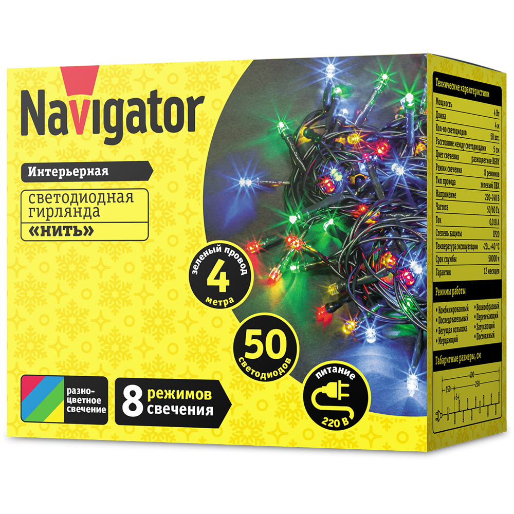 Гирлянда светодиодная 61 792 NGF-S01-50RGBY-5-4m-230-C8-G-IP20 Navigator 61792 создаст неповторимую атмосферу праздника! Благодаря разноцветному свечению светодиодная гирлянда станет превосходным решением как в качестве декора, так и в качестве украшения новогодней елки. Благодаря 8-ми режимам свечения гирлянда позволяет подобрать режим под любое настроение. 50 качественных светодиодов обеспечивают яркую, равномерную засветку. Прочный ПВХ провод защищен от повреждений при питании от сети. При производстве светодиодных гирлянд Navigator используется только провод из 100% меди с усиленной изоляцией, что гарантирует его долговечность.