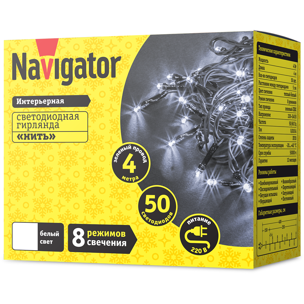 Гирлянда светодиодная 61 794 NGF-S01-50CW-5-4m-230-C8-G-IP20 Navigator 61794 подарит вашему помещению необыкновенную атмосферу праздника! 8 режимов свечения: комбинированный, волнообразный, последовательный, перетекающий, бегущая вспышка, затухающий, мерцающий, постоянный станут замечательным дополнением к созданию нрвогоднего настроения! Синий цвет свечения подчеркнет наступление зимнего праздника. 50 качественных светодиодов обеспечивают яркую, равномерную засветку. Прочный ПВХ провод защищен от повреждений при питании от сети. При производстве светодиодных гирлянд Navigator используется только провод из 100% меди с усиленной изоляцией, что гарантирует его долговечность.