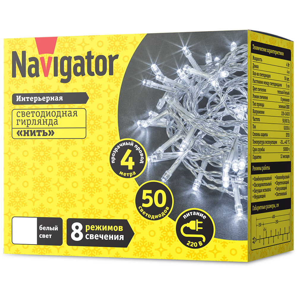Гирлянда светодиодная 61 797 NGF-S01-50CW-5-4m-230-C8-TR-IP20 Navigator 61797 станет прекрасным дополенением для декорации помещений. Благодаря увеличенной длине в 4 м она подойдет для реализации широкого спектра идей.Белый свет гирлянды станет превосходным дополнением для создания атмосферы торжества градущего праздника. Засветка пространства прозводится развномерно благодаря оснащению 50-тью светодиодами, гарантирующими отстутствие черных пятен. Доступны 8 режимов свечения: комбинированный, волнообразный, последовательный, перетекающий, бегущая вспышка, затухающий, мерцающий, постоянный! Прочный зеленый ПВХ провод защищен от повреждений при питании от сети. При производстве светодиодных гирлянд Navigator используется только провод из 100% меди с усиленной изоляцией, что гарантирует его долговечность.