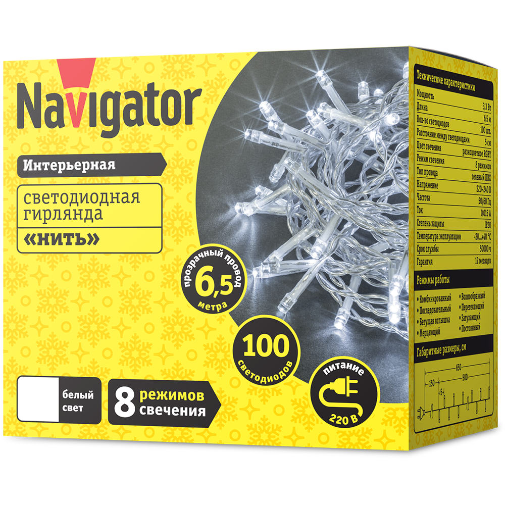 Гирлянда светодиодная 61 808 NGF-S01-100CW-5-6.5m-230-C8-TR-IP20 Navigator 61808 создаст праздничную атмосферу! Для гирлянды выбран белый цвет свечения. Длина гирлянды составляет 6,5 м, позволяя использовать её для любого дизайнерского решения в помещении. 120 светодиодов гарантируют равномерную засветку на всей протяженности гирлянды. Для данной серии доступны 8 режимов свечения: комбинированный, волнообразный, последовательный, перетекающий, бегущая вспышка, затухающий, мерцающий, постоянный! Прочный ПВХ провод защищен от повреждений при питании от сети. При производстве светодиодных гирлянд Navigator используется только провод из 100% меди с усиленной изоляцией, что гарантирует его долговечность.
