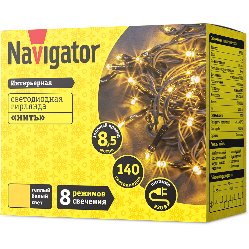 Гирлянда светодиодная 61 815 NGF-S01-140WW-5-8.5m-230-C8-G-IP20 Navigator 61815 создаст праздничную атмосферу! Для гирлянды выбран тёплый белый цвет свечения. Длина гирлянды составляет 8,5 м, позволяя использовать её для любого дизайнерского решения в помещении. 140 светодиодов гарантируют равномерную засветку на всей протяженности гирлянды. Для серии доступны 8 режимов свечения: комбинированный, волнообразный, последовательный, перетекающий, бегущая вспышка, затухающий, мерцающий, постоянный! Прочный зеленый ПВХ провод защищен от повреждений при питании от сети. При производстве светодиодных гирлянд Navigator используется только провод из 100% меди с усиленной изоляцией, что гарантирует его долговечность.