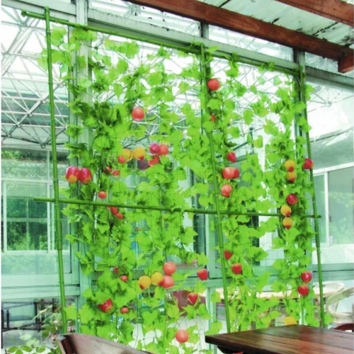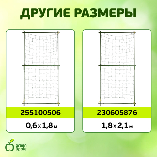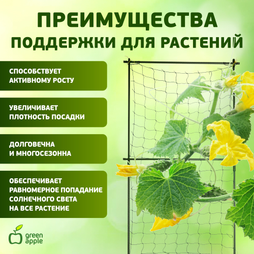 Комплект для вьющихся растений служит идеальной опорой для вертикальной поддержки вьющихся растений. Легко крепится к вертикальной опорной конструкции и используется для выращивания декоративных культур: плетистых роз, плюща, клематисов и пр. Сетка служит идеальной опорой для вертикальной поддержки вьющихся и лазающих растений. С помощью сетки также можно легко задекорировать стены любых построек, возвести беседки, арки. Раскидистые растения с тяжелыми стеблями часто требуют дополнительной поддержки. Комплект Green Apple не только эффективно решает эту задачу, но и придает опрятный внешний вид посадкам. Рамка из опор придает сетке особую прочность.