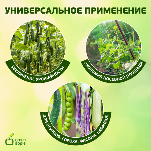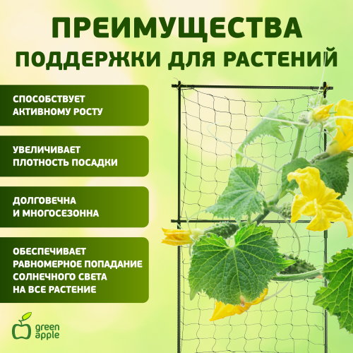 Комплект для вьющихся растений служит идеальной опорой для вертикальной поддержки вьющихся растений. Легко крепится к вертикальной опорной конструкции и используется для выращивания декоративных культур: плетистых роз, плюща, клематисов и пр. Сетка служит идеальной опорой для вертикальной поддержки вьющихся и лазающих растений. С помощью сетки также можно легко задекорировать стены любых построек, возвести беседки, арки. Раскидистые растения с тяжелыми стеблями часто требуют дополнительной поддержки. Комплект Green Apple не только эффективно решает эту задачу, но и придает опрятный внешний вид посадкам. Рамка из опор придает сетке особую прочность.