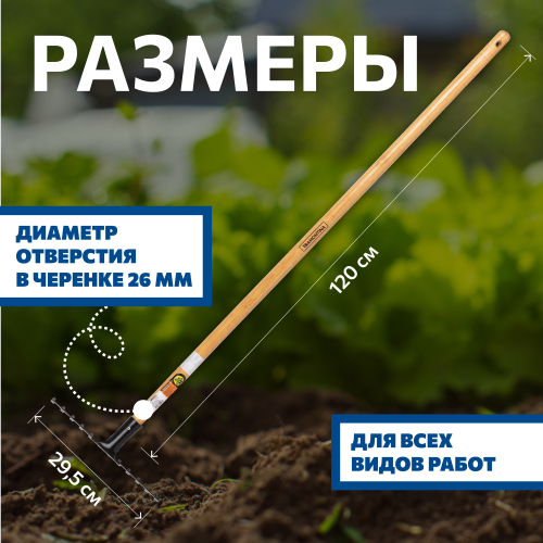 - Рукоятка длиной 120 см отличается высокой прочностью и изготовлена из древесины из возобновляемых источников.