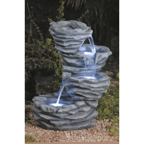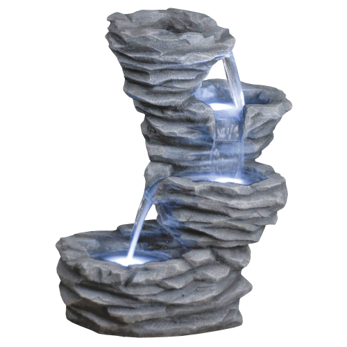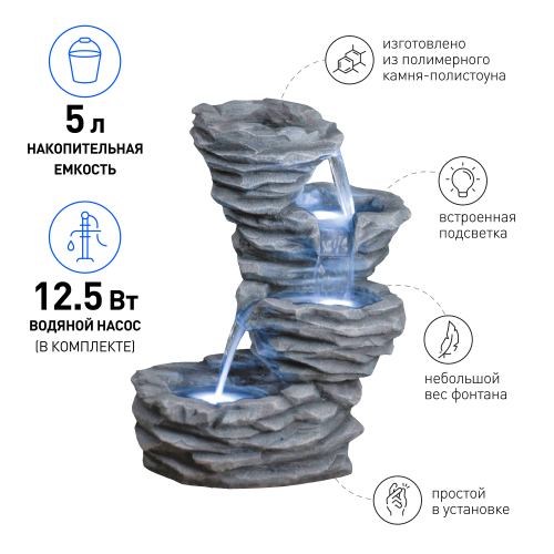 Садовые фонтаны GREEN APPLE GWXF02637 - отличное решение, если Вы хотите украсить ландшафт участка своего загородного дома, коттеджа или дачи с минимальными затратами сил и средств. В последнее время садовыми фонтанами облагораживают территории не только частных домовладений, но и общественных мест для отдыха: ресторанов, кафе, гостиниц, санаториев, пансионатов, парков, скверов и т. д. Имеет встроенную подсветку. Аккуратно выньте фонтан из коробки. В комплект входит насос, его необходимо установить внутрь фонтана на присоски. Затем присоединить к насосу пластиковую трубку, которая закреплена внутри фонтана. Фонтан имеет замкнутую систему, с помощью насоса вода направляется вверх, затем стекает по декоративным элементам вниз.