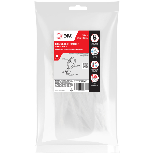 Кабельные стяжки (хомуты) анкерные ЭРА обладают неразъёмным замковым механизмом одностороннего действия и предназначены для оперативной прокладки проводников внутри распределительных шкафов. Обеспечивают увязку кабелей и проводов в пучок, жгут и надежную фиксацию проводов на стенках НКУ при помощи специального анкерного зажима. Предварительно должны быть подготовлены отверстия для крепления на стенках или в монтажной панели электрощита. Изготавливаются из нейлона белого цвета.