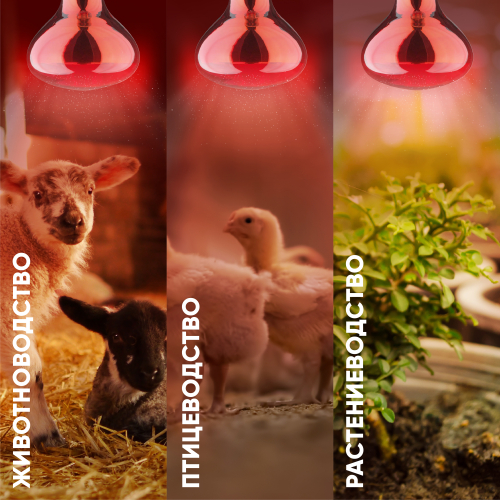 Инфракрасная зеркальная лампа с красной колбой. Активно используется в животноводстве, птицеводстве и растениеводстве. Максимальная тепловая мощность без яркого света. Идеальна для стабилизации теплового баланса новорождённых и молодых животных. 100 % энергии переходит в тепловую. Работа лампы не зависит от скачков сети, микроимпульсов. Не требуются стабилизаторы напряжения – лампа работает даже при пониженном напряжении. Мгновенно включается и нагревается. Минимум пульсаций освещения. Компактные размеры (удобно при транспортировки и использовании). Используется только с керамическими цоколями (не с пластиковыми!).