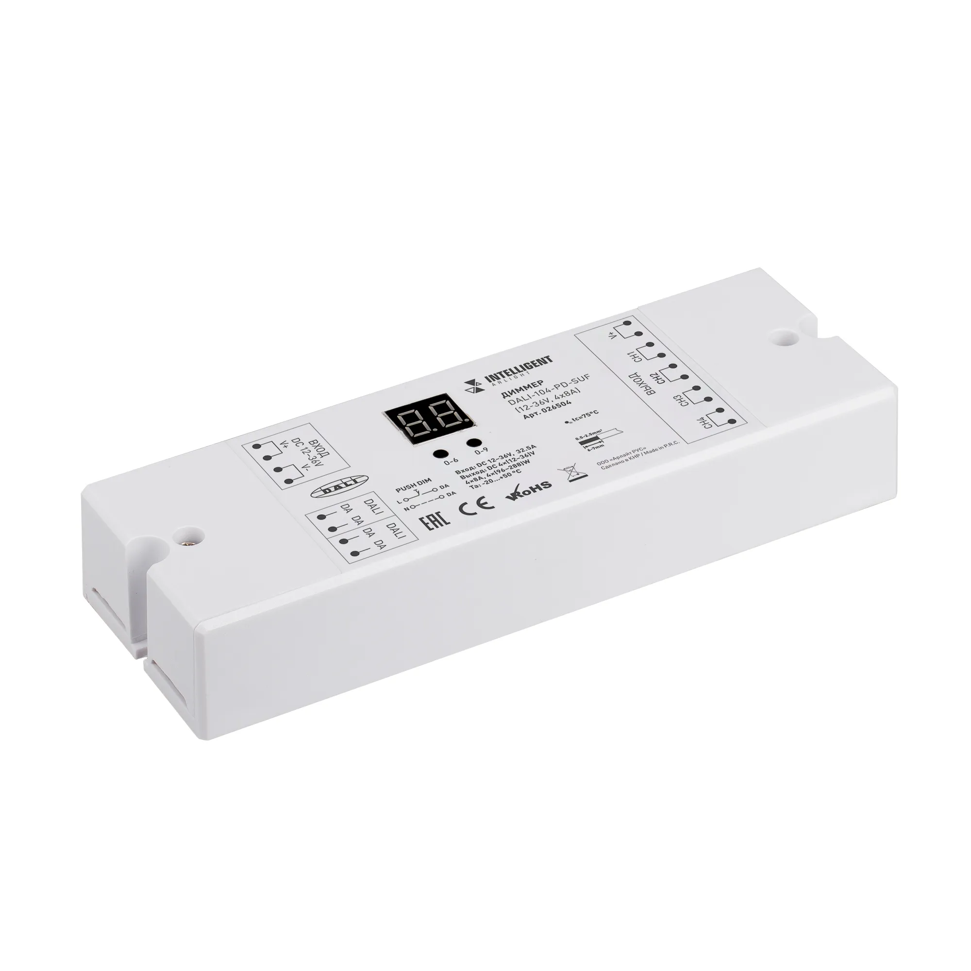 Универсальный мощный 4-канальный диммер для управления одноцветной или мультицветной светодиодной лентой в протоколе DALI DT6. Устройство имеет входной сигнал DALI, 4 адреса и совместимо со всеми блоками питания и панелями с выходом DALI марки Arlight и Intelligent Arlight. Управление диммером осуществляется кнопками на корпусе, а информация о режиме отображается на цифровом дисплее. Питание диммера имеет диапазон напряжений от 12В до 36В, максимальный ток 8А на 1 канал, максимальная мощность 384-1152Вт (в зависимости от напряжения питания). Возможно управление внешней кнопкой с помощью функции Push-Dim. Габариты диммера составляют 168x58x28мм, корпус изготовлен из пластика белого цвета.