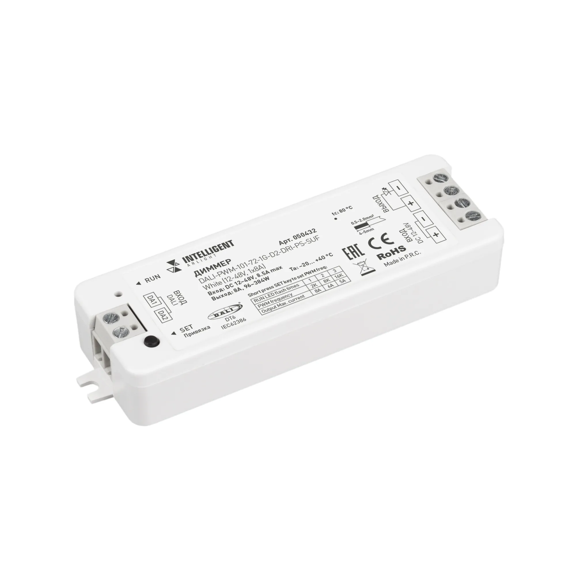 Одноканальный диммер для управления одноцветной светодиодной лентой в протоколе DALI DT6. Устройство имеет входной сигнал DALI, 1 адрес и совместимо со всеми устройствами с выходом DALI марки Arlight и Intelligent Arlight. Питание диммера имеет диапазон напряжений от 12В до 48В, максимальный ток 8А, максимальная мощность 96-384Вт (в зависимости от напряжения питания). Наличие клемм Push-Dim для управления с помощью возвратных нажимных выключателей. Габариты диммера составляют 105.7 х33х18мм, корпус изготовлен из пластика белого цвета.