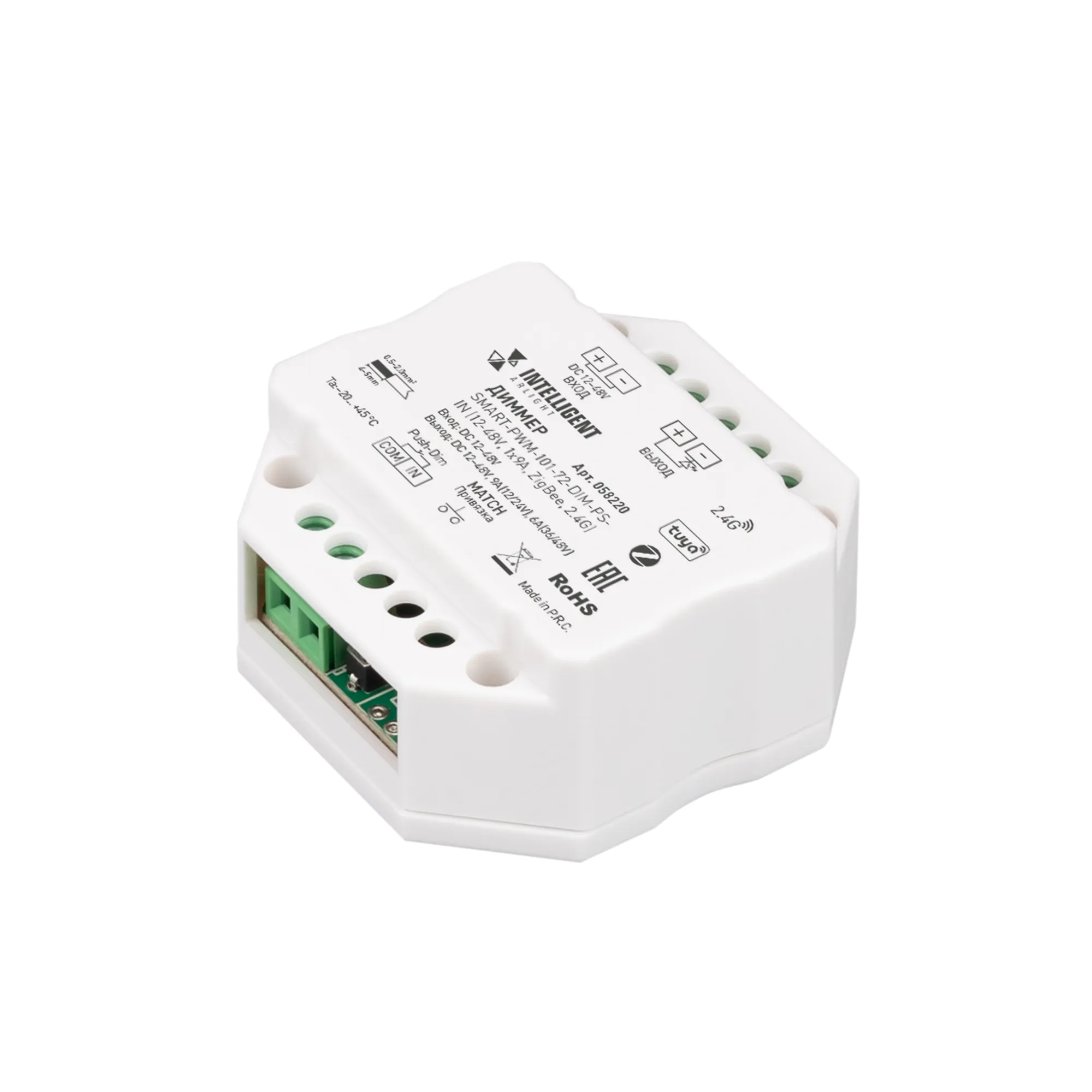 Диммер для управления одноцветными светодиодными DIM лентами (ШИМ). Выполняет функции: включение/выключение, регулировка яркости. Диммер совместим с беспроводной облачной платформой TUYA посредством сети Zigbee (с подключением через конвертер Zigbee - WiFi). Управление доступно со смартфона через приложение INTELLIGENT ARLIGHT или Smart Life. Реализована функция Push-Dim - для управление с помощью возвратных нажимных выключателей. Устройство совместимо с радиочастотными пультами дистанционного управления и настенными панелями управления серии SMART. Возможна привязка до 10 пультов или панелей управления. Рабочее напряжение 12-48В, максимальная нагрузка 9A на канал при напряжении (DC12-24V) и 6А на канал при напряжении (DC36-48V), максимальная мощность для 12-24В - 108-216Вт, для 36-48В - 216-288Вт. Выбор частоты ШИМ (500Hz, 2kHz, 8kHz, 16kHz), а также выбор кривой диммирования (линейная, логарифмическая) производится с помощью DIP-переключателей. В устройстве реализована функция плавного включения/выключения в течение 3с. Доступно управление с помощью голосового помощника Алиса от Яндекс. Диммер подходит для установки в стандартную монтажную коробку. Габаритные размеры составляют 52х52х26 мм.