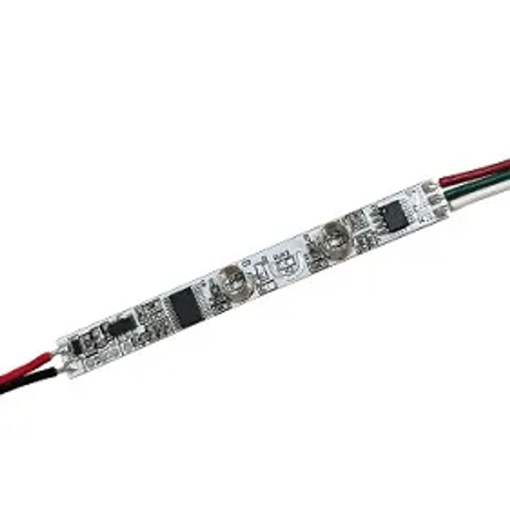 Миниатюрный сенсорный диммер, предназначенный для включения, выключения, регулировки яркости свечения и цветовой температуры двухцветных светодиодных лент, установленных в алюминиевый профиль, закрытый пластиковым экраном, высотой от 5 до 10 мм. Высокая чувствительность сенсорного датчика и индикация состояния, плавное изменение яркости и цветовой температуры без заметных ступенек, реагирует на прикосновение к экрану профиля в месте установки. Управление производится с помощью 2 сенсорных кнопок. В комплекте наклейки для обозначения места расположения кнопок. Высота пружины 10 мм. Питание 5-24В, максимальная нагрузка 2А на канал, 2 канала,, выходная мощность 15-72 Вт (в зависимости от напряжения питания). Габариты устройства 77х7.8х10 мм.