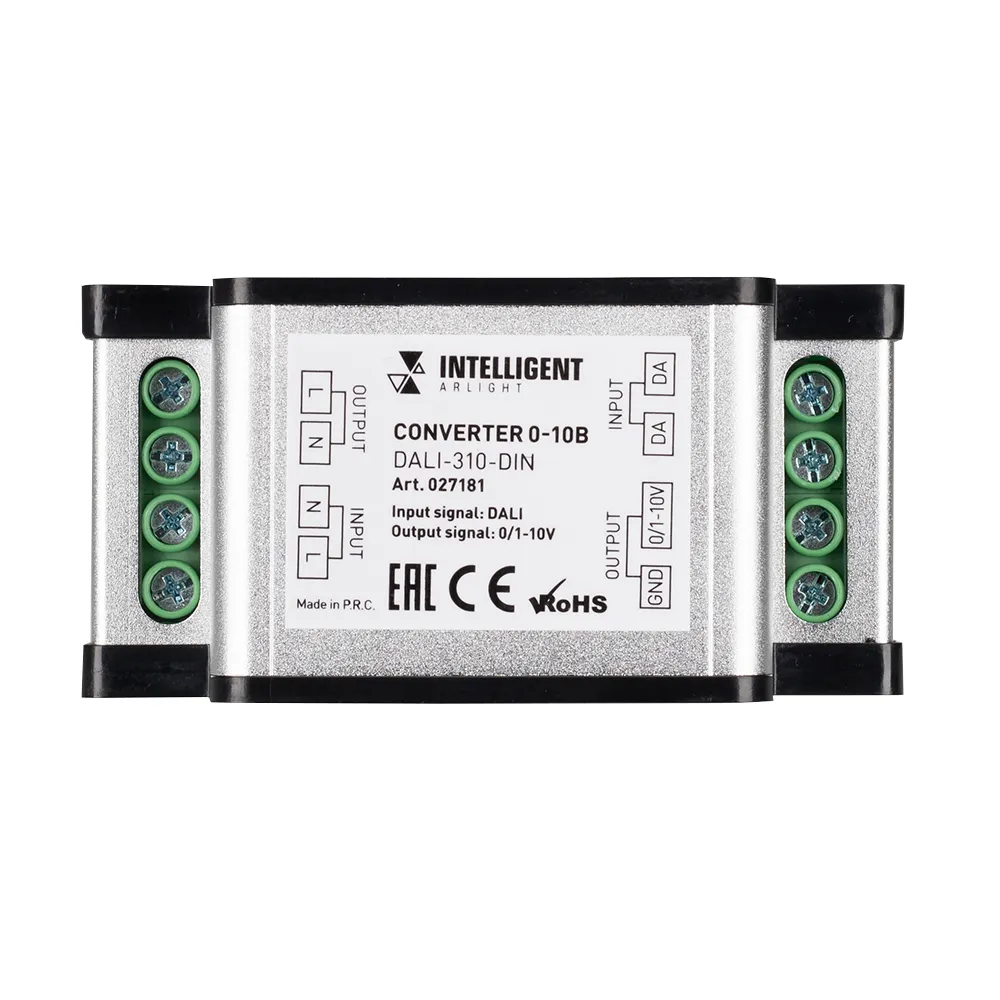 Конвертер цифрового сигнала DALI в аналоговый сигнал 0/1-10В для управления диммерами или диммируемыми блоками питания с управлением 0/1-10В. Конвертер может управлять яркостью, а также, включением и выключением света. Конвертер совместим с панелями управления с выходом DALI и контроллерами DALI. Питание устройства от 230В, максимальный ток 5А, максимальная мощность для ламп накаливания 575 Вт, для светодиодных источников света - 280ВА. Выбор выходного сигнала 0-10В или 1-10В. Габариты конвертера составляют 92х36х60мм, корпус чёрного цвета, установка на DIN-рейку.