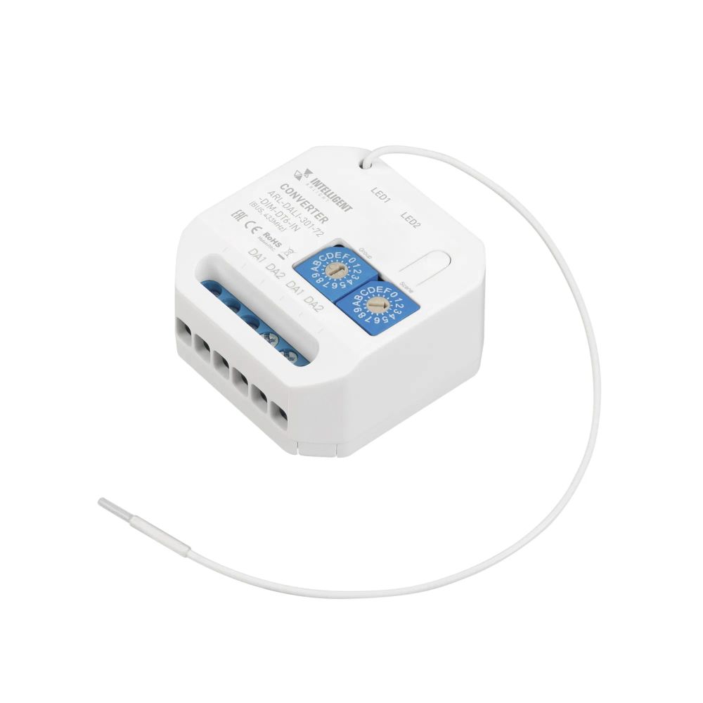 Конвертер поддерживает до 20 беспроводных устройств в памяти и позволяет настраивать группы управления и световые сцены с помощью роторных вращателей. Совместимость со стандартом DALI обеспечивает прямое управление устройствами (группы, сцены).